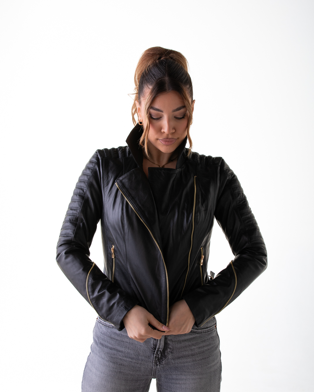 Predstavljamo vam Hera – elegantnu žensku jaknu od vrhunske jagnjeće kože, sa upečatljivim metalnim detaljima.