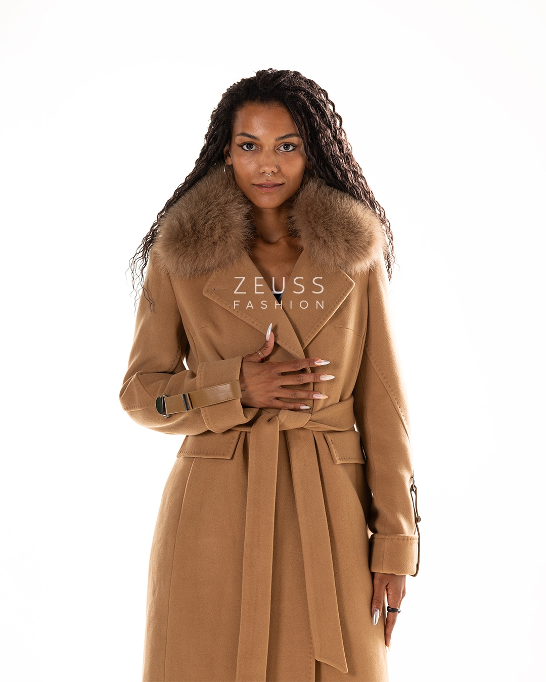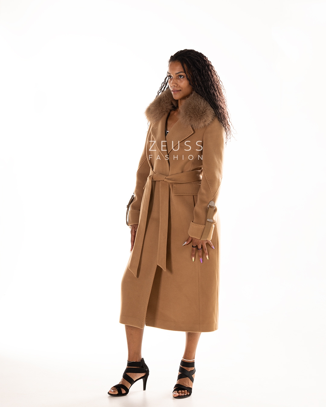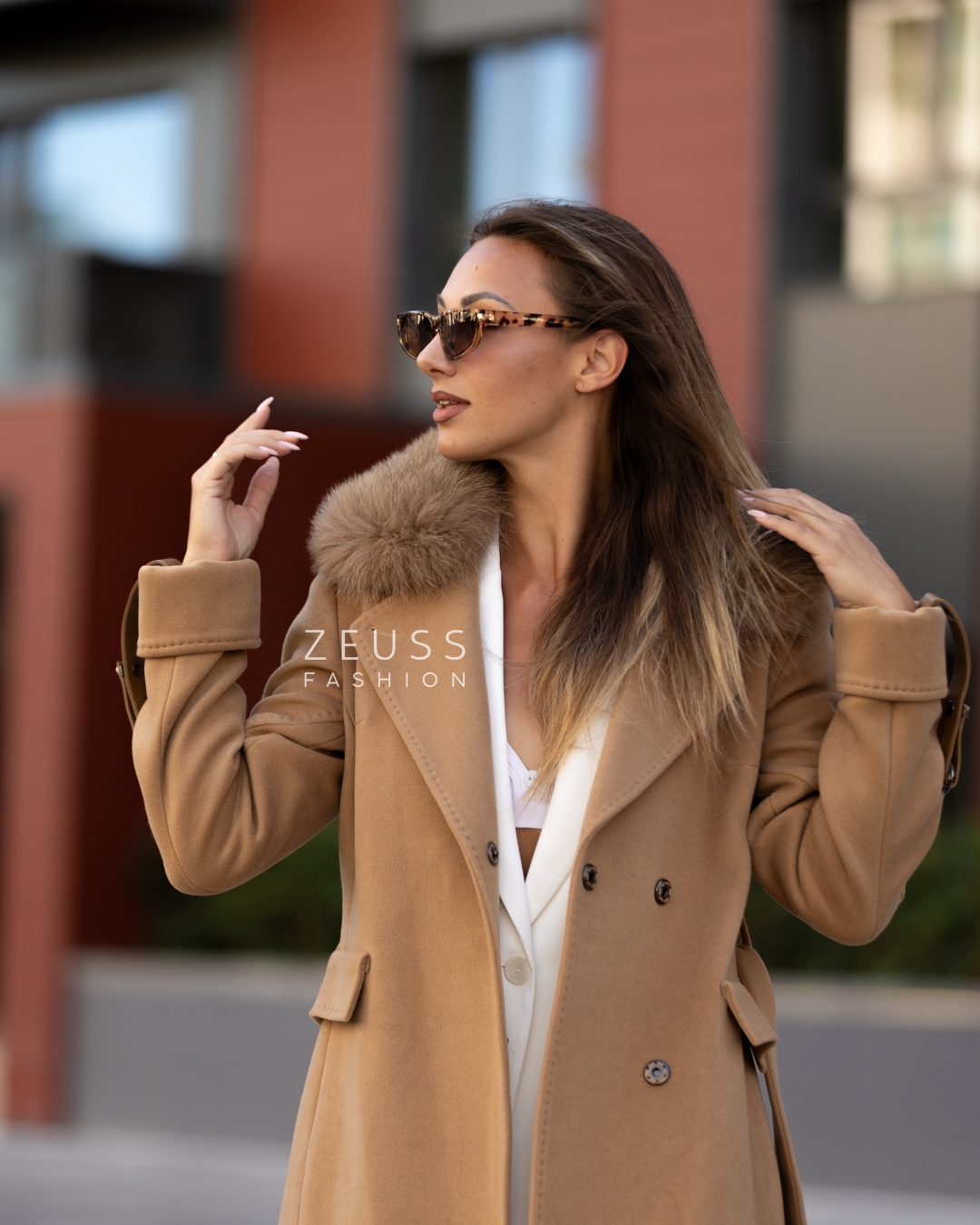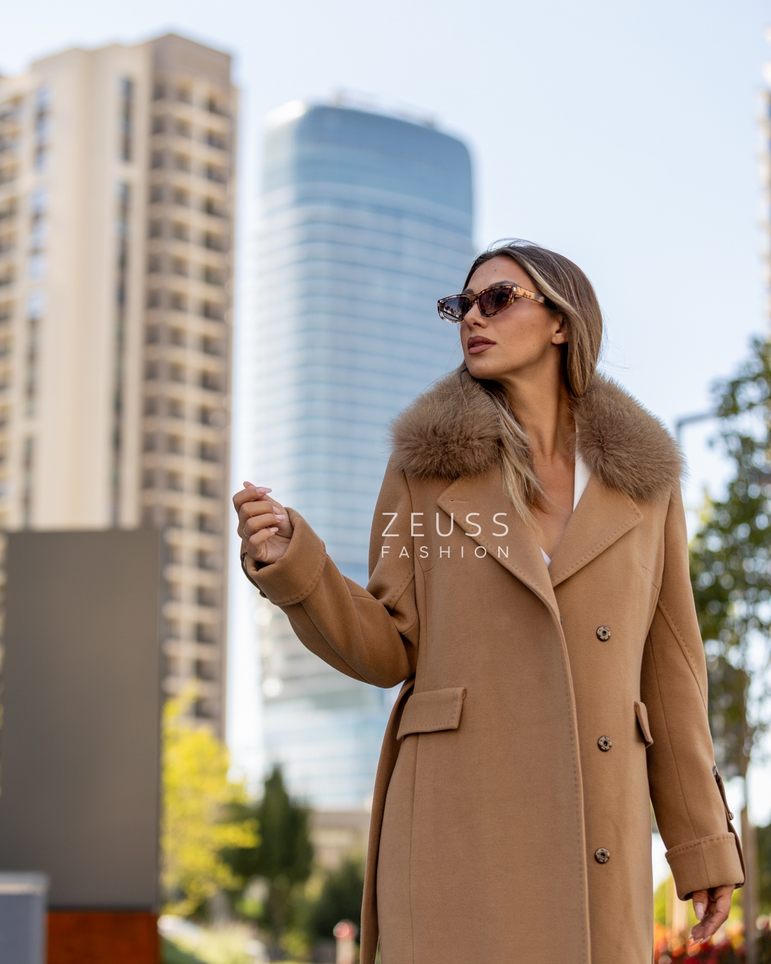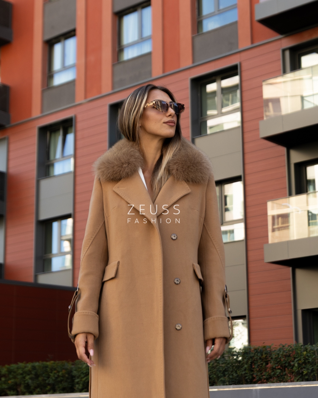 Duži kaput od kašmira sa prirodnim krznom koje se može skidati. Dostupan u braon i sivoj boji. Elegancija za svaku priliku.
